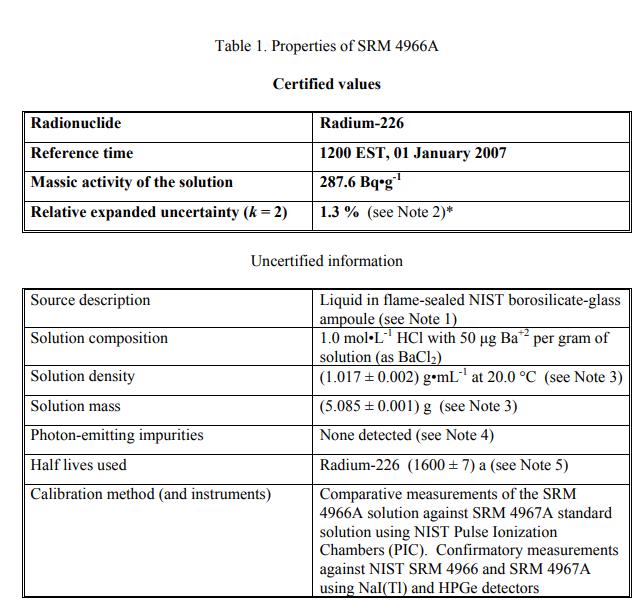 在 2007 年 1 月 1 日美國東部標準時間 1200 的參考時間,經(jīng)認證的 Radium-226 質(zhì)量活度值為:(287.6 ± 3.7) Bq?g-1