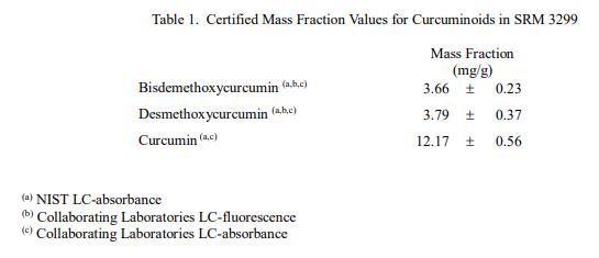 表 1 和表 2 提供了 SRM 3299 中姜黃素和元素的認(rèn)證質(zhì)量分?jǐn)?shù)值,以干質(zhì)量為基礎(chǔ)報(bào)告。NIST 認(rèn)證值是 NIST 對(duì)其準(zhǔn)確度有最高置信度的值因?yàn)樗幸阎蚩梢傻钠?jiàn)來(lái)源都已被調(diào)查或采取考慮[1]。價(jià)值分配分析由 NIST 和合作實(shí)驗(yàn)室進(jìn)行。認(rèn)證值計(jì)算為 NIST 方法平均值的未加權(quán)平均值和合作實(shí)驗(yàn)室平均值的加權(quán)中值(在適當(dāng)?shù)那闆r下)。相關(guān)的不確定性以大約 95% 的置信水平表示 [2-4]。
