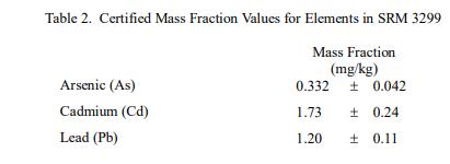 水分測(cè)定:SRM 3299 的水分含量在 NIST 通過(guò) (1) 冷凍干燥 7 天至恒重進(jìn)行測(cè)定; (2) 用高氯酸鎂在干燥器中室溫干燥28 d; (3)在80℃的強(qiáng)制通風(fēng)烘箱中干燥2h。對(duì)所有三種技術(shù)的平均值進(jìn)行平均,以確定每克接收質(zhì)量的 (0.9146 ± 0.0060) 克干質(zhì)量比例;此值上顯示的不確定性是擴(kuò)展的不確定性,代表 95 % 的置信水平。用于將數(shù)據(jù)從原樣轉(zhuǎn)換為干質(zhì)量基礎(chǔ)的轉(zhuǎn)換因子是干質(zhì)量比例的倒數(shù),即原樣數(shù)據(jù)除以 0.9146 以確定干質(zhì)量結(jié)果。從水分測(cè)量中獲得的轉(zhuǎn)換因子的相對(duì)不確定度為 0.3%,并包含在本證書(shū)中提供的認(rèn)證值的不確定度中,以干重為基礎(chǔ)報(bào)告。