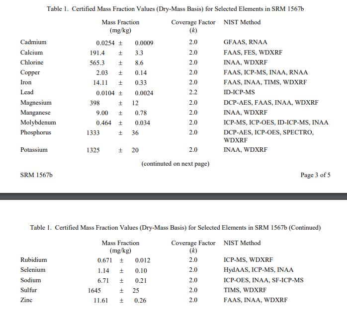 表 1 提供了 SRM 1567b 中選定元素的認(rèn)證質(zhì)量分?jǐn)?shù)值。 NIST 認(rèn)證值是 NIST 對(duì)其準(zhǔn)確性的最高置信度的值,因?yàn)樗幸阎蚩梢傻钠顏?lái)源都已調(diào)查或考慮[1]。以質(zhì)量分?jǐn)?shù)單位 [2] 以干質(zhì)量為基礎(chǔ)報(bào)告值。